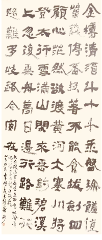 李鹏飞的书法筑基传统,楷书从欧楷入手融合魏碑雄健之气,隶书取法《曹全碑》《衡方碑》等经典,行草则师法二王、苏黄与八大,篆书更是深得吴昌硕石鼓文笔意,老辣遒劲。观其书法作品,如《竹里馆》《除夜》等,笔墨间气象犹如万马奔腾,又如春风细雨丝丝入扣,隶草作品中线条的方折劲直与迟留赏会相映成趣,运用墨色的浓淡干湿焦营造出虚实相生的意境。他秉持“崇古方可创新”的理念,以“最大的功力打进去,最大的勇气打出来”,在对经典的深度研习中有所突破,让书法作品成为情感与思想的载体,其章草古瘦清雅如腊月寒梅,隶书则在传统范式中融入个人意趣,勾勒出恢宏强健的艺术特色。
