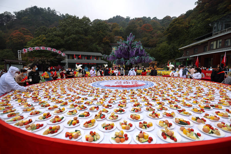 2022年10月1日,河南省洛阳市栾川县,5A级景区老君山在海拔1800余米的中天门广场继续推出国庆无人值守的“一元午餐”,游客自行投币一元钱,自助找零,全程无人值守,全凭自觉。“一元午餐”在保留充满地域特色的糊涂面条基础上,配备有馒头、煮鸡蛋,还有蒸红薯、黄瓜条、小番茄等组合的拼盘。