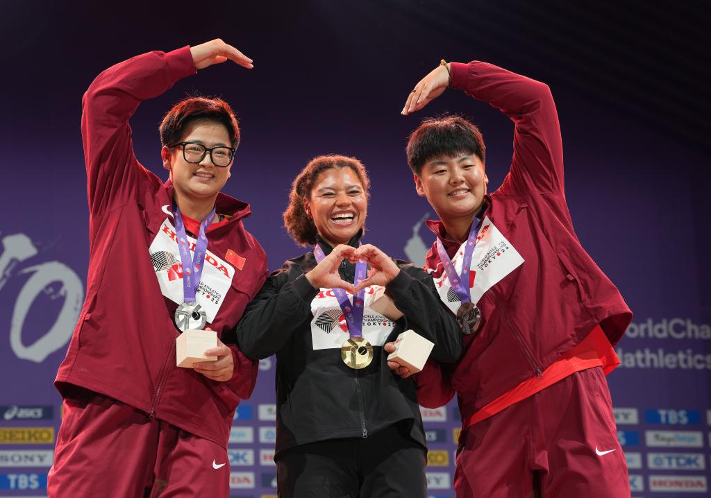 9月16日,冠军加拿大选手罗杰斯(中)、亚军中国选手赵杰(左)和季军中国选手张家乐(右)在颁奖仪式上合影。当日,2025年世界田径锦标赛女子链球颁奖仪式在日本东京举行。新华社记者 江汉 摄