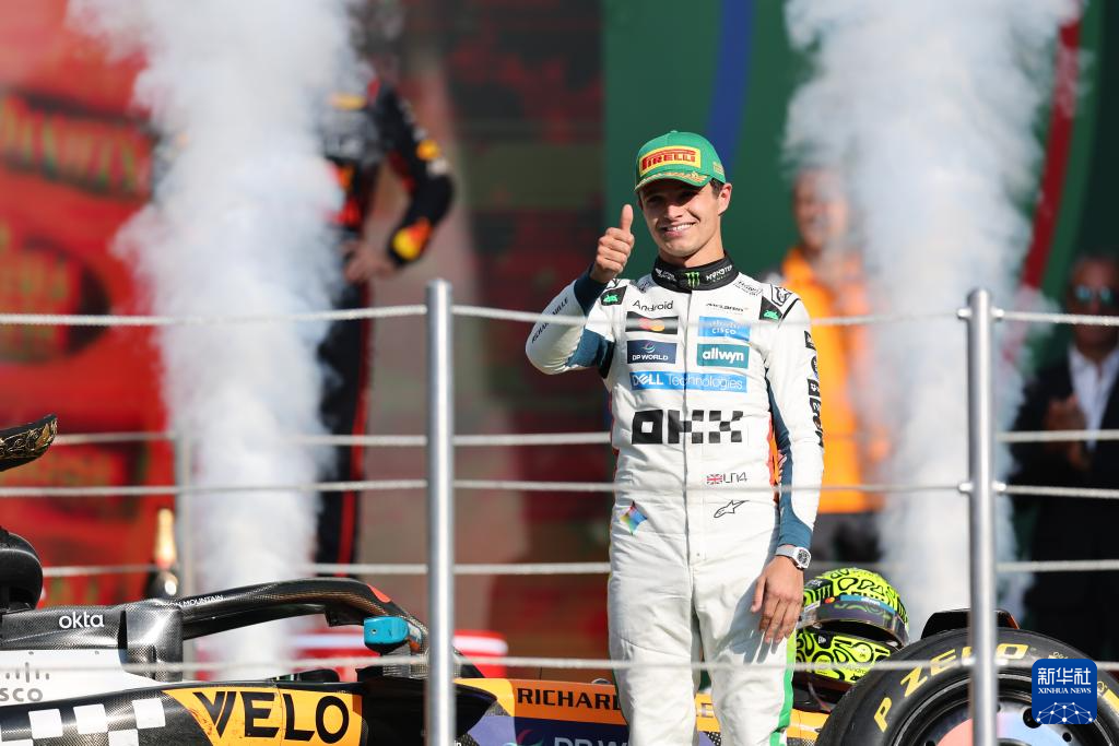 10月26日,冠军迈凯伦车队英国车手诺里斯在赛后庆祝胜利。
