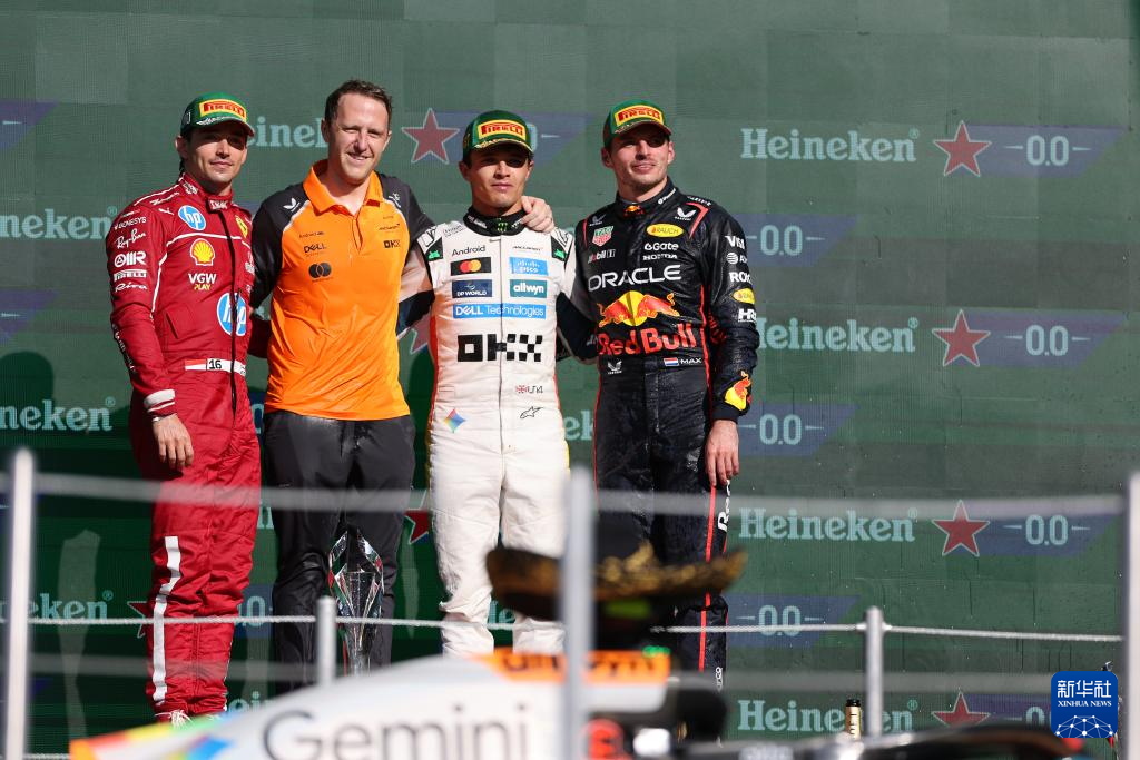 10月26日,迈凯伦车队英国车手诺里斯(中)、法拉利车队摩纳哥车手勒克莱尔(左)、红牛车队荷兰车手维斯塔潘(右)在赛后参加颁奖仪式。