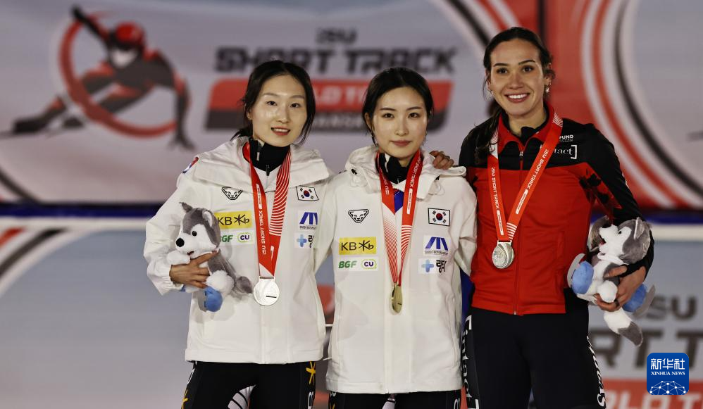 11月23日,冠军韩国选手金吉莉(中)、亚军韩国选手崔敏静和季军加拿大选手萨罗尔特在颁奖仪式上合影。