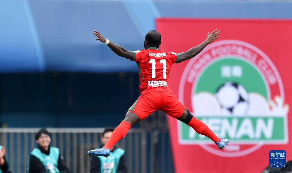 11月22日,河南足球俱乐部酒祖杜康队球员阿奇姆彭在比赛中庆祝进球。