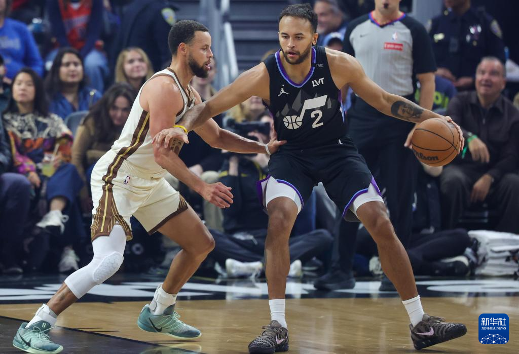 11月24日,勇士队球员库里(左)防守爵士队球员李凯尔。