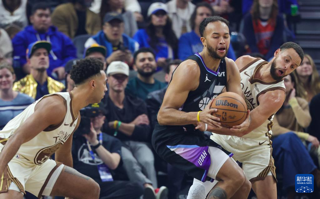 11月24日,爵士队球员李凯尔(中)与勇士队球员库里(右)在比赛中拼抢。
