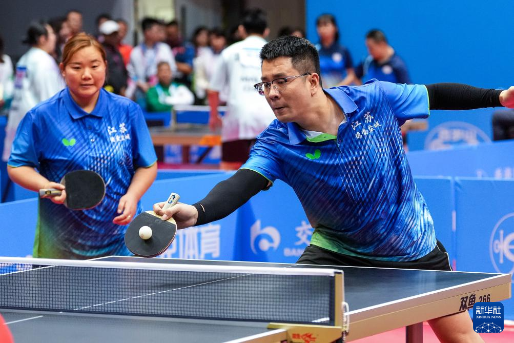 12月8日,江苏队选手张良忠/夏井兰(左)在与新疆队组合王伟/张馨月的比赛中。最终,张良忠/夏井兰获得冠军,王伟/张馨月获得亚军。