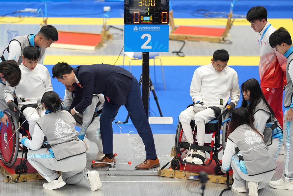 12月10日,裁判和志愿者在男子个人重剑C级金牌赛前帮助广东一团选手钟英杰(左)和罗兴东固定轮椅。新华社记者 侯俊 摄