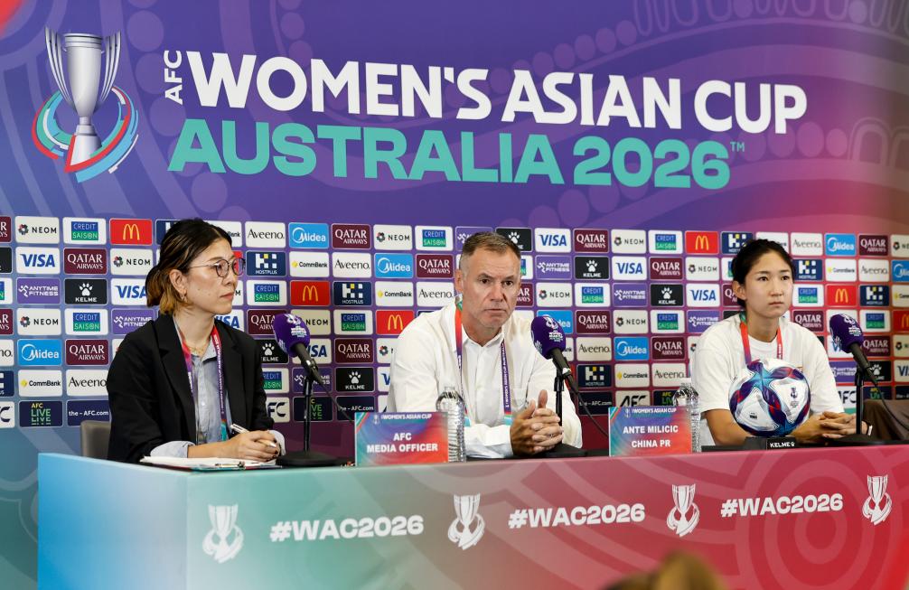 ↑3月16日,中国女足主教练米利西奇(中)和球员王妍雯(右)在新闻发布会上。新华社发(周丹摄)