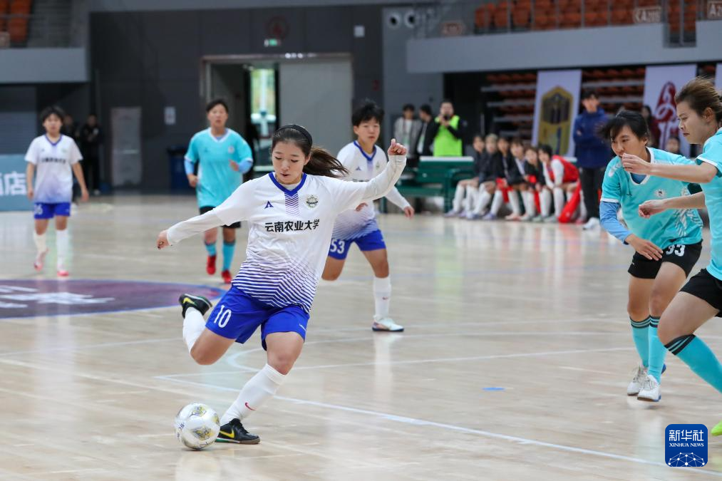 11月5日,云南玉昆农大女足队球员李羽彤(左)在与首都体育学院队的比赛中射门。