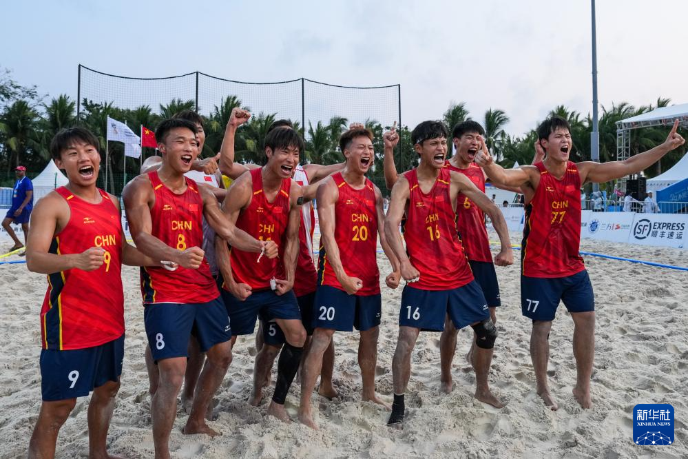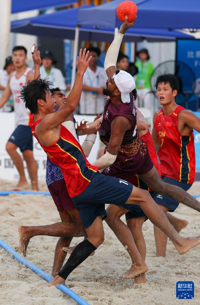 4月21日,在海南三亚举行的第六届亚洲沙滩运动会沙滩手球男子小组赛中,中国队2比0战胜斯里兰卡队。