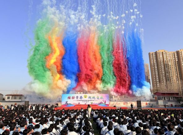 随着校长一声“开幕”的宣布,礼炮齐鸣,彩烟绽放,将现场气氛推向高潮,鲁山县育英高中第三届体育艺术节正式启幕。